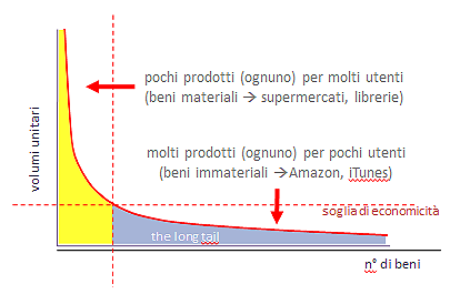 Nel caso dei libri, la soglia di economicità è rappresentata dal minimo numero di copie vendute (i.e. persone interessate al titolo) che consente al libraio di rientrare dei costi sostenuti per disporre del volume ed esporlo sullo scaffale (“costi di scaffale”). I volumi con un potenziale di lettori più basso della soglia di economicità non sono disponibili se non a richiesta. Lo studio di Stanford ha rivelato che se la “long tail” scende molto lentamente (i.e. il n° dei titoli di nicchia proposti è molto maggiore dei best-seller), l’integrale della “long tail” non è affatto il 20%, ma addirittura maggiore dell’area dei best-seller (area gialla nella figura). Quindi la “long tail” presenta un numero di lettori potenziali molto più alto dell’insieme dei titoli più noti, a condizione però di poter disporre di un numero molto grande di titoli a costi di scaffale molto bassi. In questi casi è conveniente, come ha fatto inizialmente Amazon con i libri (e poi iTunes con la musica), utilizzare gli strumenti di Internet per abbassare drasticamente la soglia di economicità legata al “costo dello scaffale” e poter proporre una varietà enorme di libri introvabili nelle librerie tradizionali e spesso anche on-line. Da notare che, una volta fidelizzati su contenuti di nicchia, gli utenti probabilmente compreranno i best-seller dallo stesso canale dei prodotti di nicchia, cosa che è puntualmente accaduta sia con Amazon che con iTunes.
